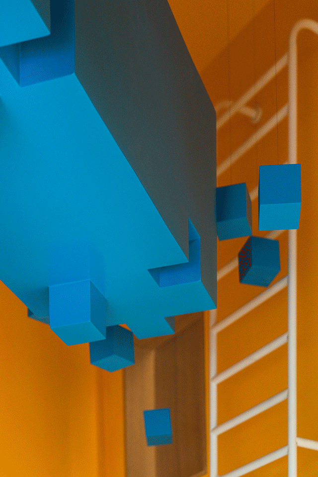 洽谈区的设计大胆地运用色彩与几何语汇,像素化的墙面装置与地毯、体块化的沙发与扶手椅、悬空的小白屋与金属网制的“俄罗斯方块”……每一个意象在空间中的创新表达与多元转译,其背后皆投射出设计师对艺术与生活融合的美术洞见,令简单中有丰沛的蕴涵。