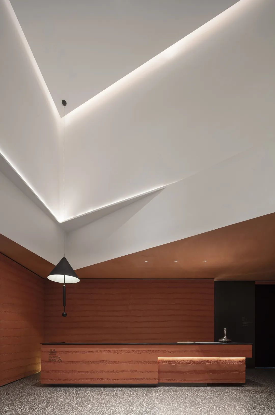 纯白与砖红对应天与地的角色。纯白的“天际”以光为笔,在曲折转回之下,勾勒出空间的立体层次。好比绘画中的白描,不加渲染,把焦点留给形态、意境而非装饰。