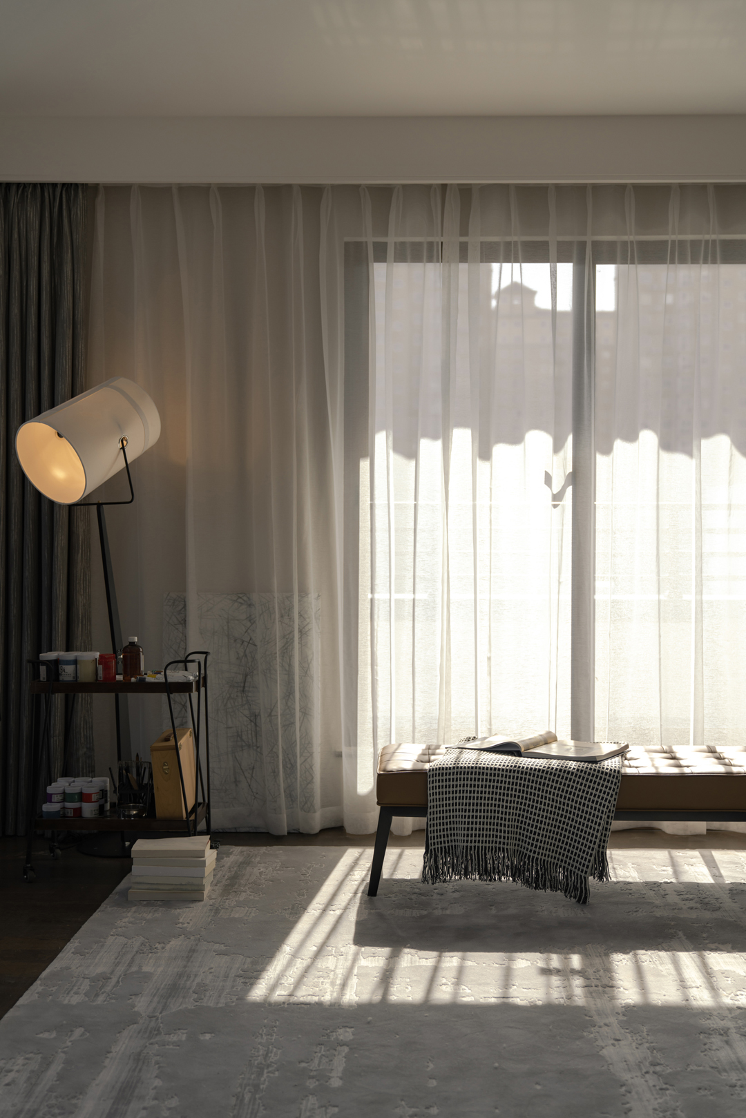 主人房在柔和而富有质感的色彩搭配中,以低饱和度的对比,温柔地承托了主人私人时光。而丝滑的布料、柔韧的皮革、温润的木材给身体提供了不同的触感,这是最真实的生活,其中展示的闲适,也是最贴合内心的生活方式。