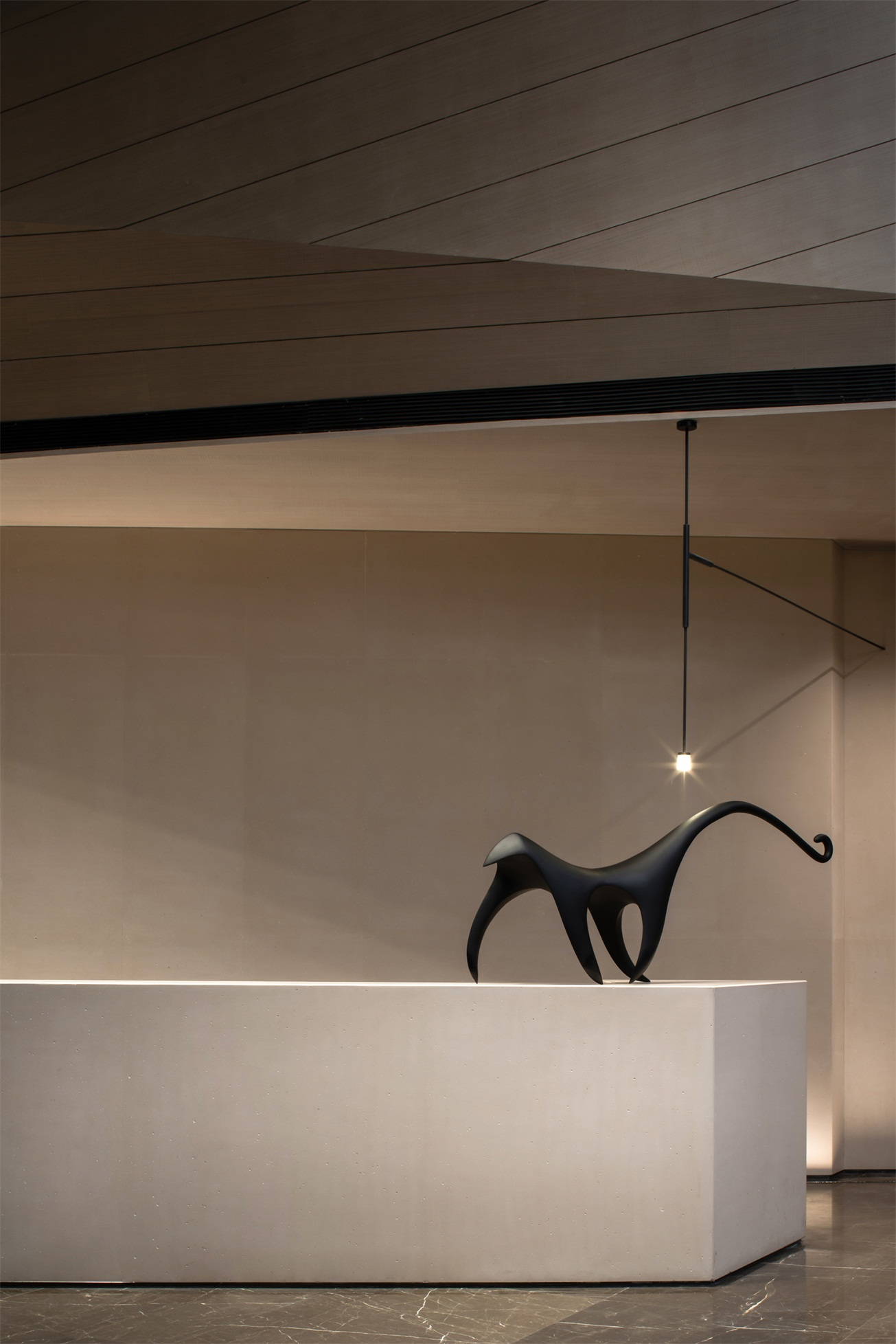 墙面上的抽象挂件作为一个个独立的元素存在,以非常规形态,打造形成空间视觉焦点与空间精神的构成元素之一。“被勾破的缎面”,“像布料般柔软的木材”……立体挂件上视觉与触觉之间、虚与实之间产生的冲突感,构成了空间不凡的艺术张力。