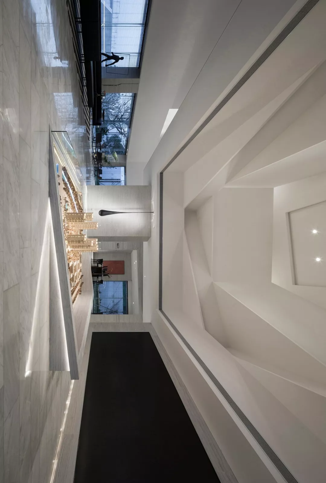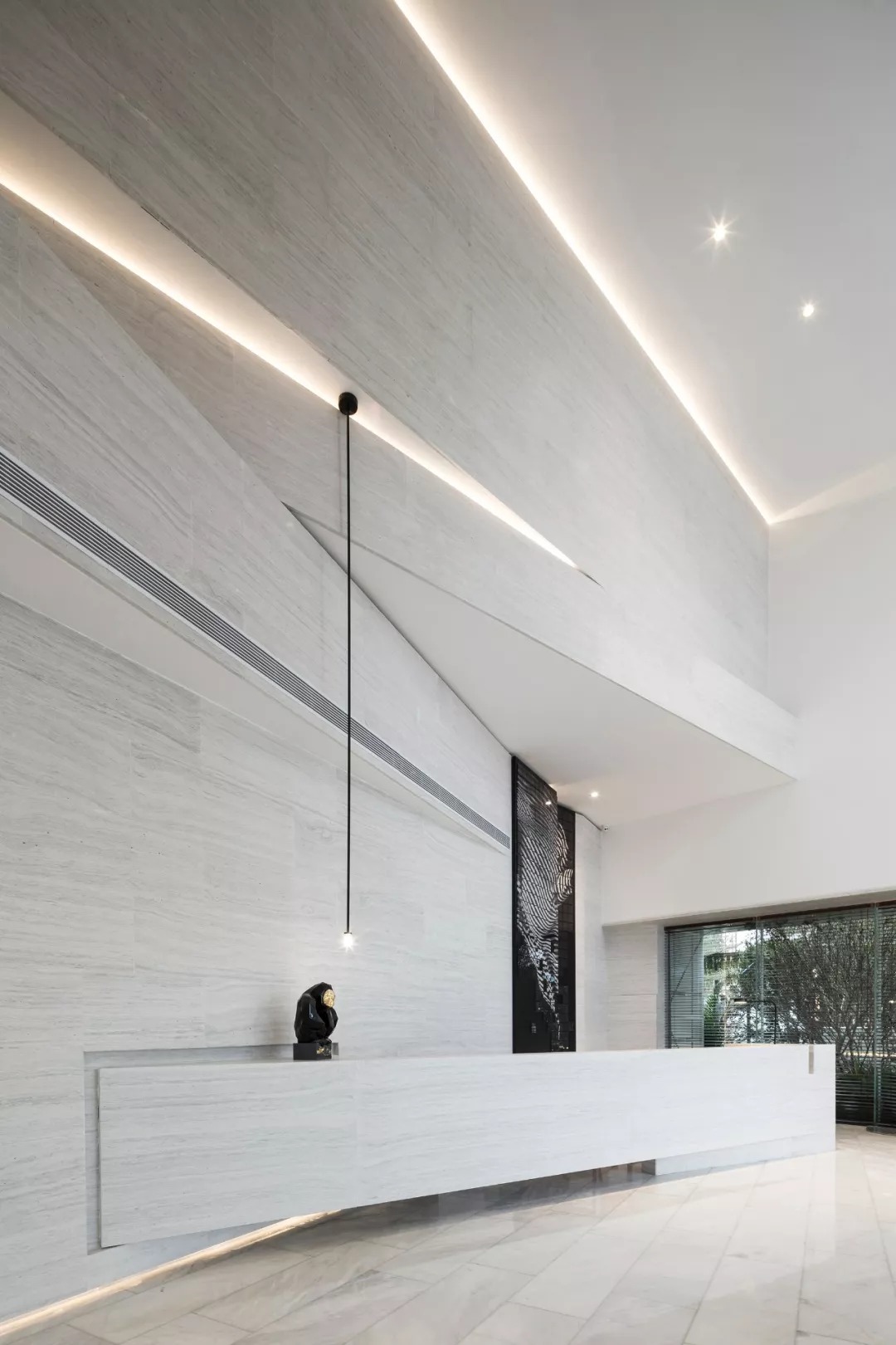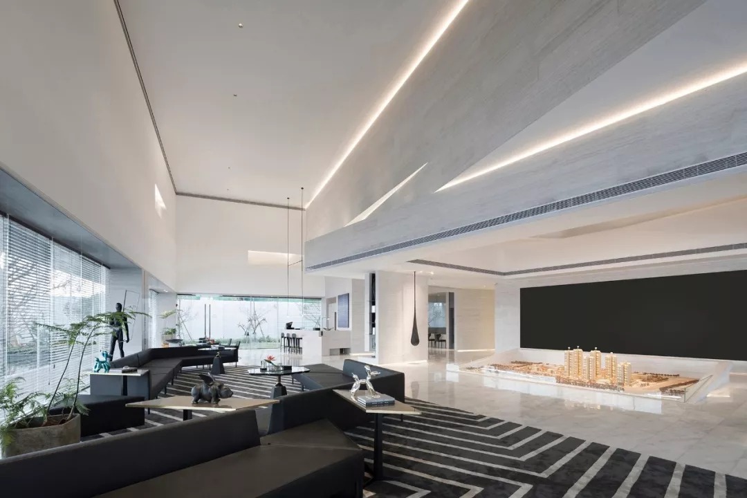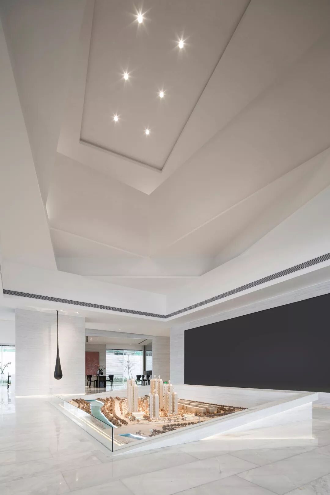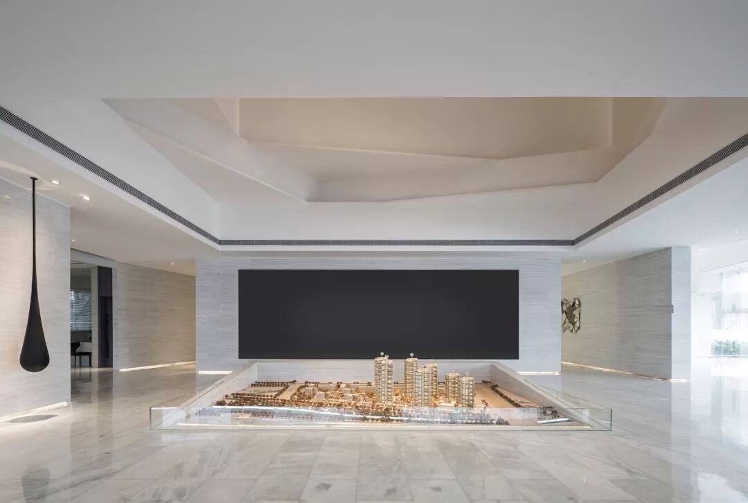 墙面、天花、接待台、水吧台、陈列柜、沙盘模型,均以延续性的块面元素、创意性而简约的视觉造型、纯粹的现代主义美学及精尚的质感,定制出属于这个空间的设计语言。行进空间,建筑体块的起承转合、层高不一的组合,展演出空间丰富的层次感、转折自然的秩序性。